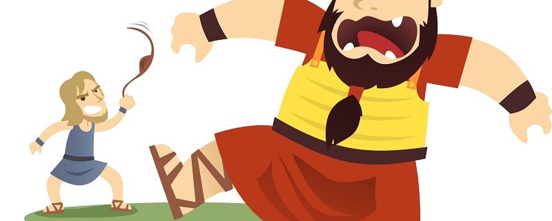 Nincs más fegyvere Dávidnak, csak a botja meg a parittyája. Kiválaszt a patakból öt kis követ. Az lesz a lőszer. És hopp, máris Góliát előtt terem.